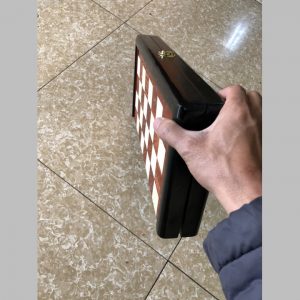 Bàn cờ vua làm bằng gỗ hương và có thể gấp gọn, với khóa cài chắc chắn đảm bảo không làm rơi rớt các quân cờ bên trong.